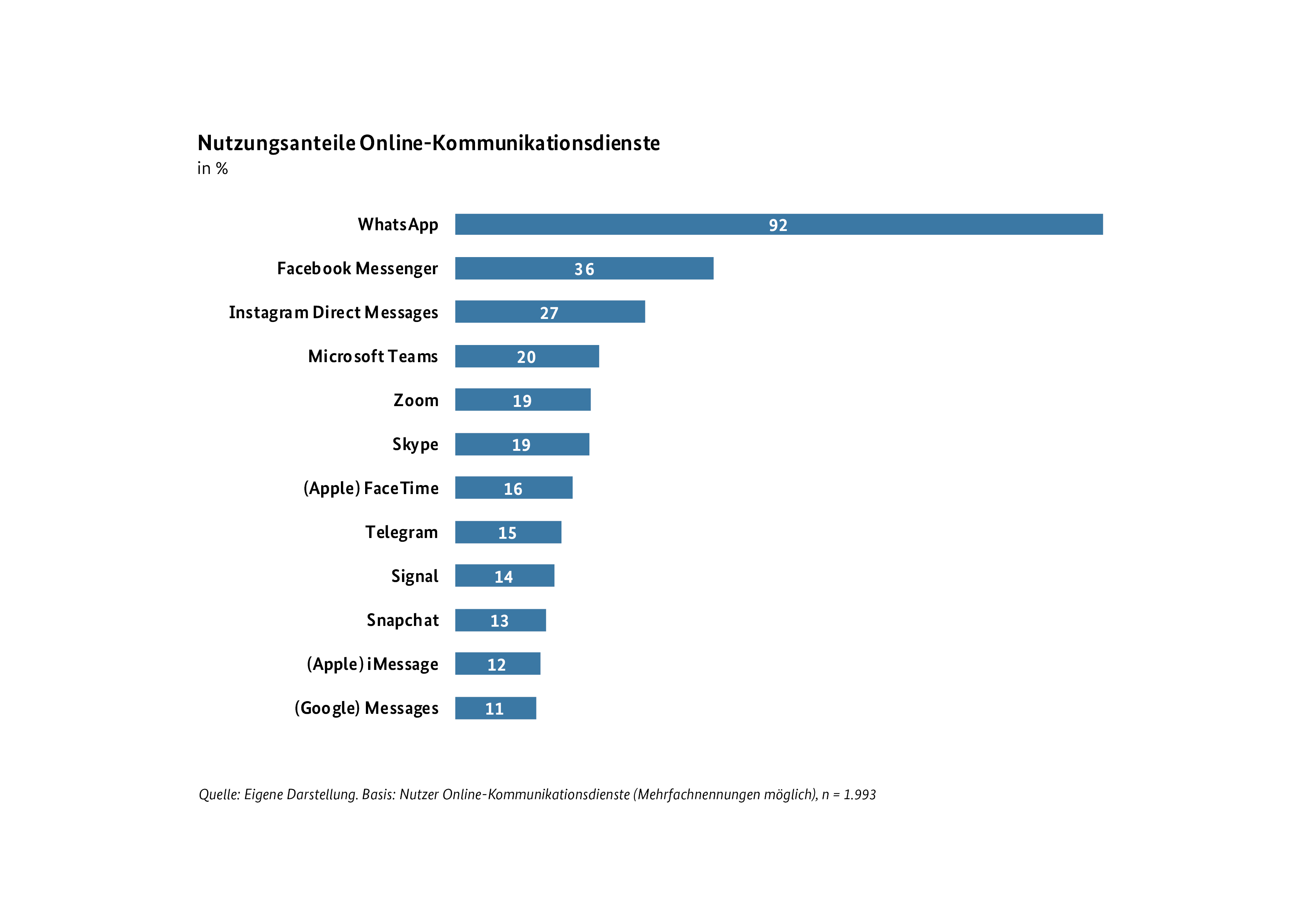 Die beliebtesten Online-Kommunikationsdienste in Deutschland erreichen folgende Nutzungsanteile: 92 Prozent WhatsApp (2021: 93 Prozent), 36 Prozent Facebook Messenger (2019: 39 Prozent), 27 Prozent Instagram Direct Messages (2019: 25 Prozent), 20 Prozent Microsoft Teams (2021: 14 Prozent) und 19 Prozent Zoom (2021: 18 Prozent).