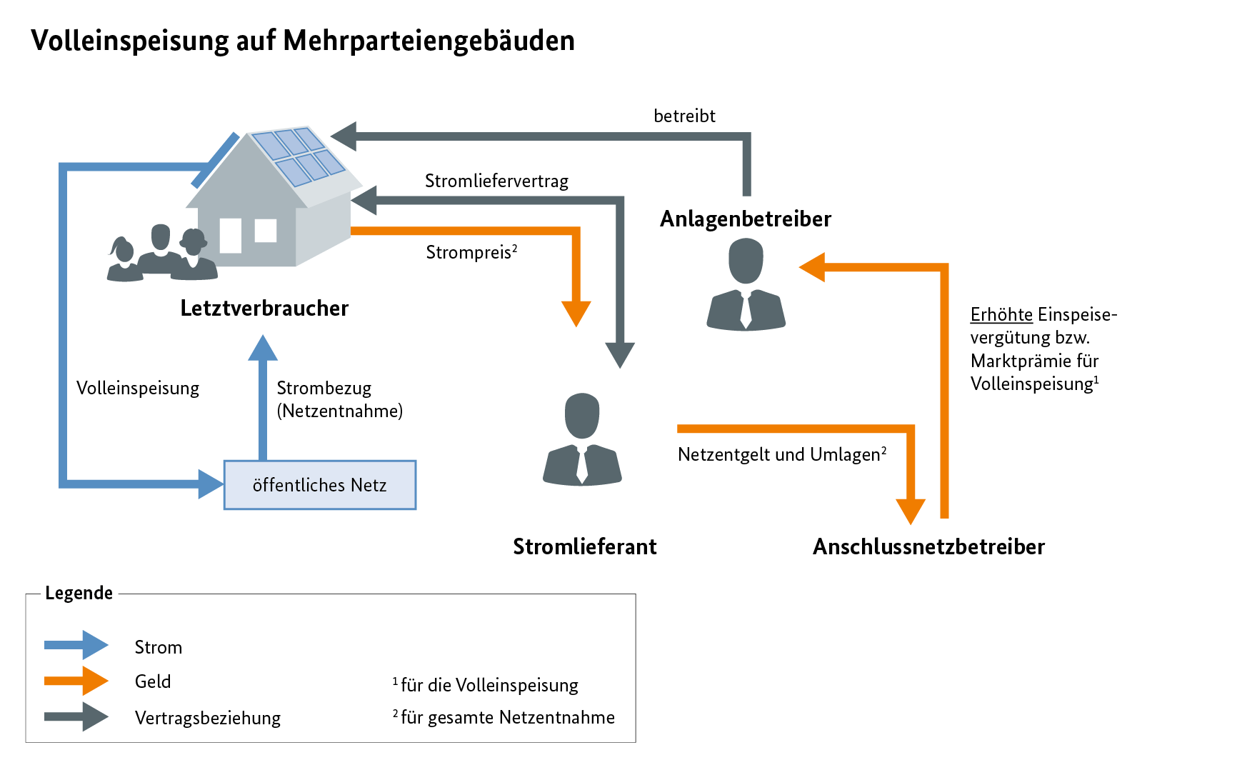 Für den in Netz einspeisten Strom kann der Anlagenbetreiber keinen „Mieterstromzuschlag“ zusätzlich in Anspruch nehmen. Die Letztverbraucherinnen und -verbraucher im Gebäude werden im Fall der Volleinspeisung „ganz normal“ von dem Stromlieferanten ihrer Wahl versorgt.
