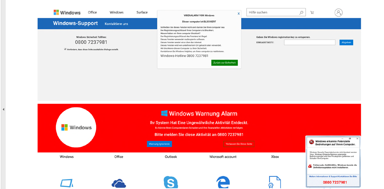 Pop-up-Fehlermeldungen sind Einblendungen auf Ihrem Computer (sog. Pop-up-Fenster), die täuschend echt Viren- oder Softwareprobleme vorgeben. So lassen sich zum Beispiel offene Anwendungen auf dem PC nicht mehr schließen. Häufig ertönt dabei auch ein akustisches Signal oder eine Sprachnachricht, was Sie zusätzlich verunsichern soll. Angeblich kostenlose Hilfe verspricht Ihnen in diesem Moment eine eingeblendete Telefonnummer.