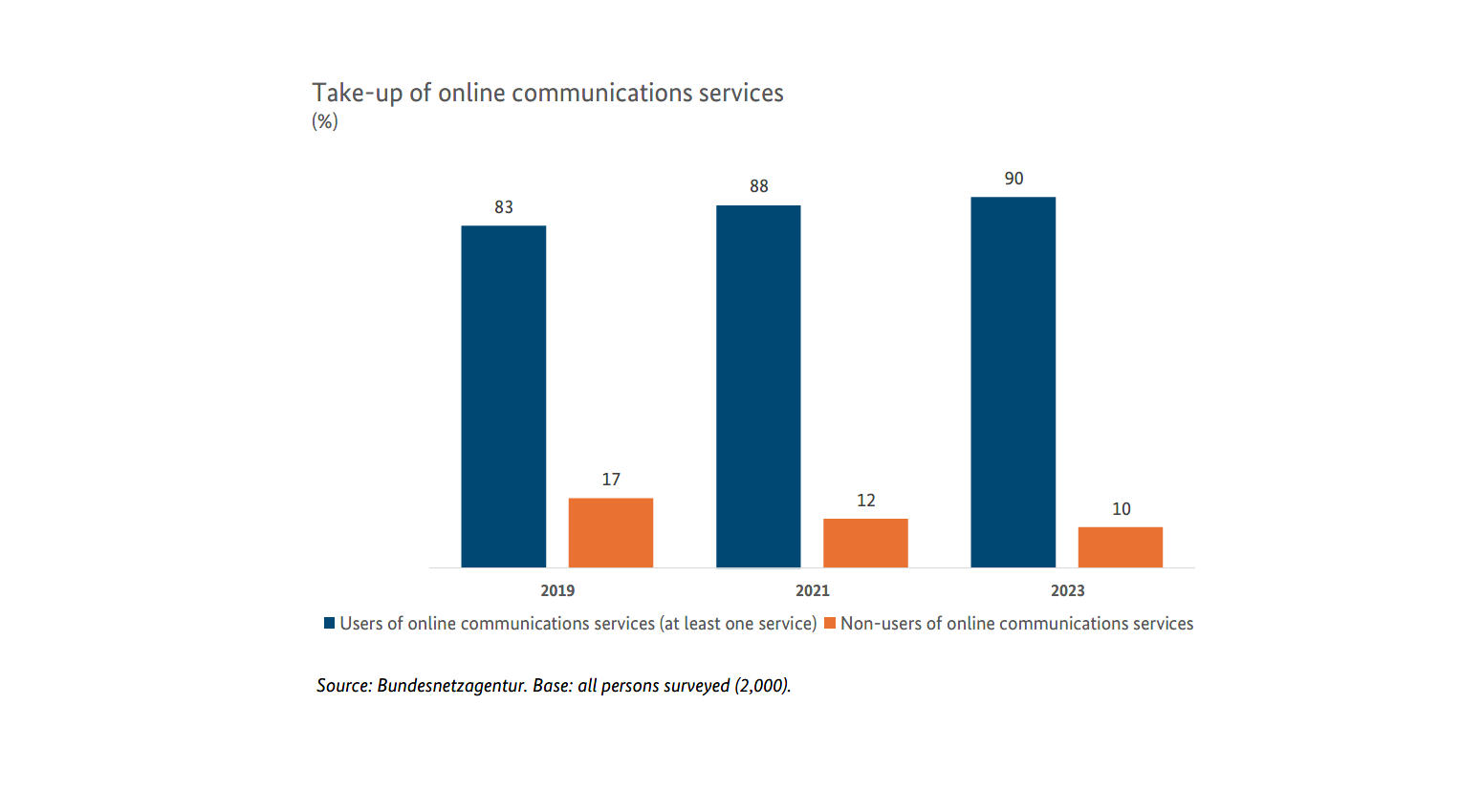 90% of Germany’s population aged 16+ regularly use online communications services (at least once a month), mainly with smartphones. This represents an increase of seven percentage points compared with 2019. Overall, the take-up of these services is comparable to that of traditional telecommunications services.