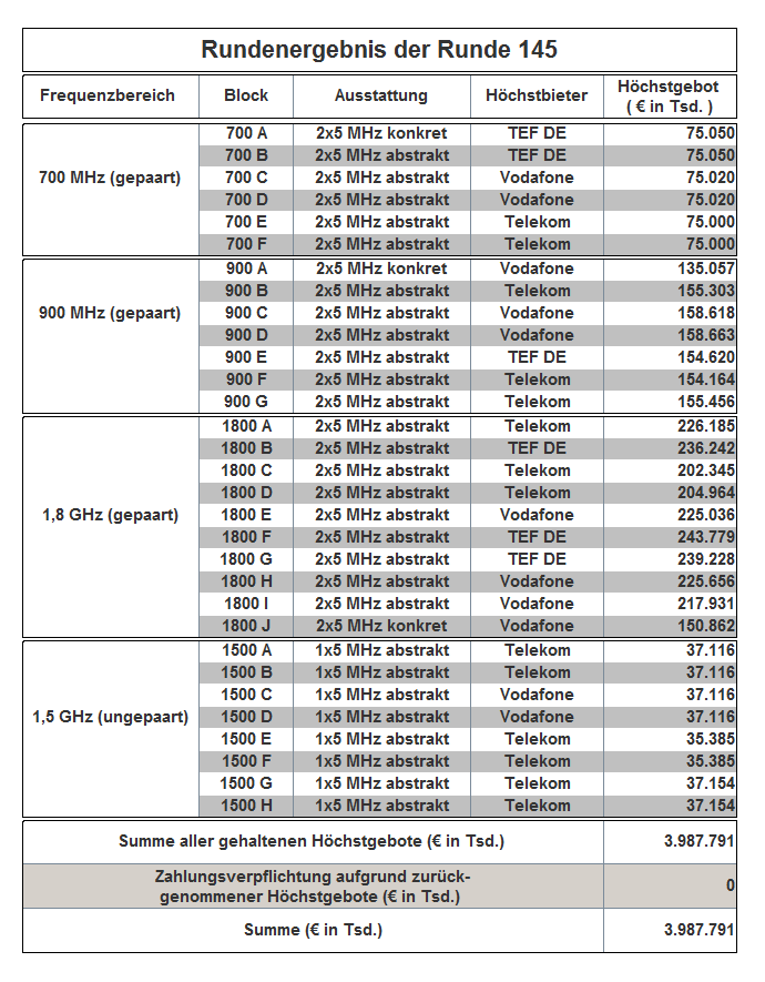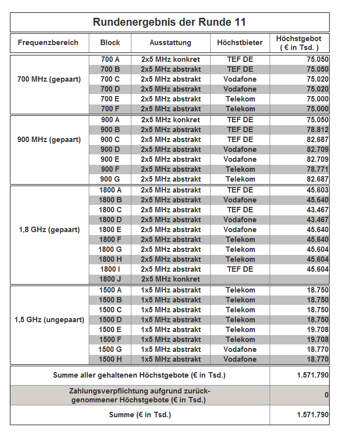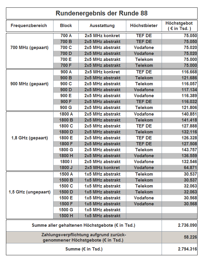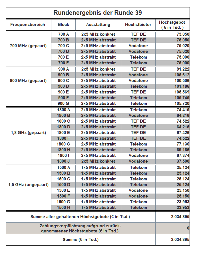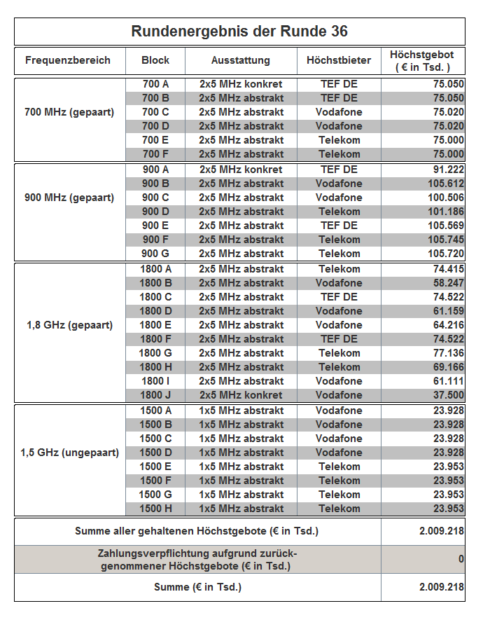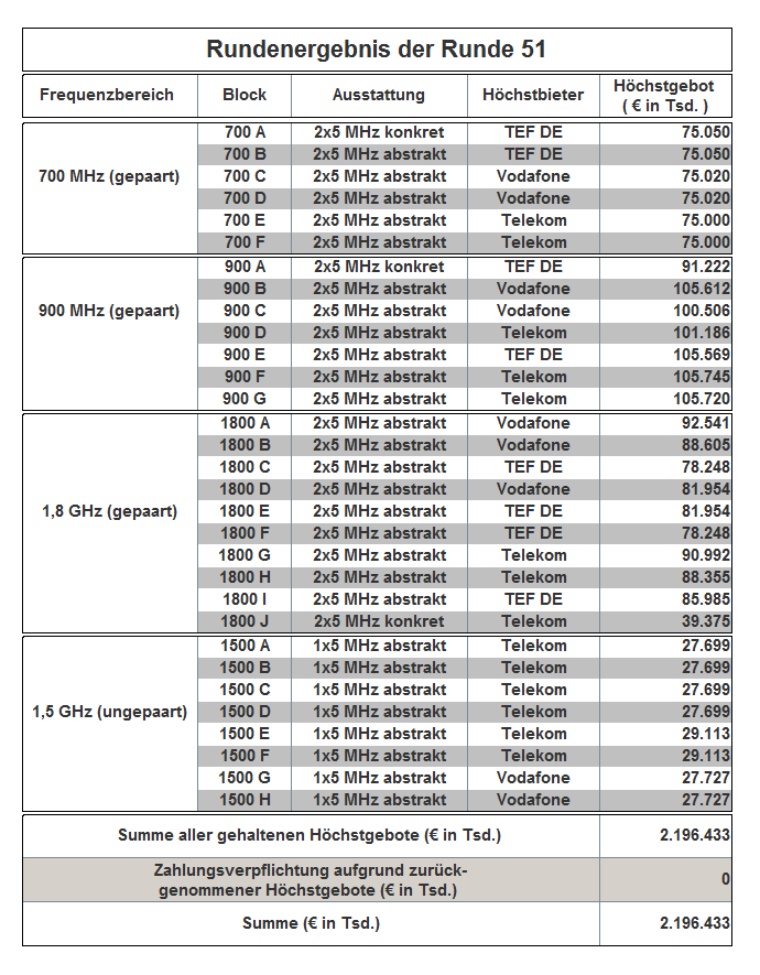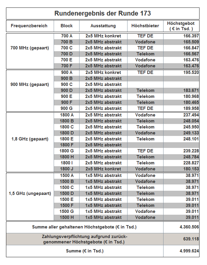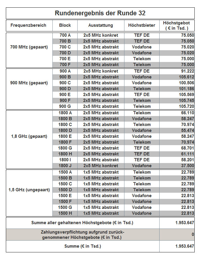 The auction has been held as an open ascending simultaneous multiround auction. The award proceedings finished in auction round 181 with the following result: