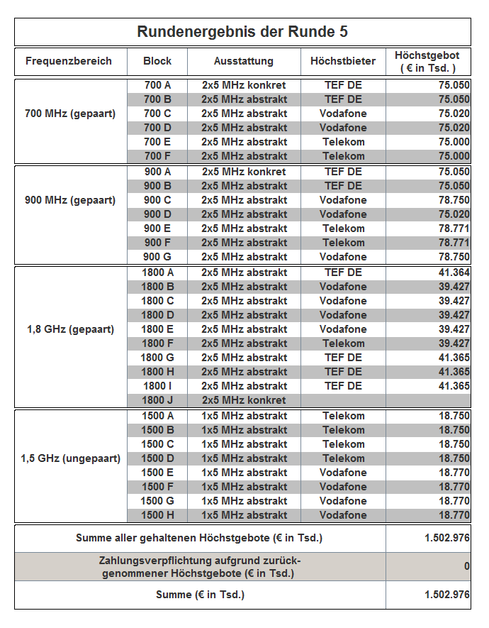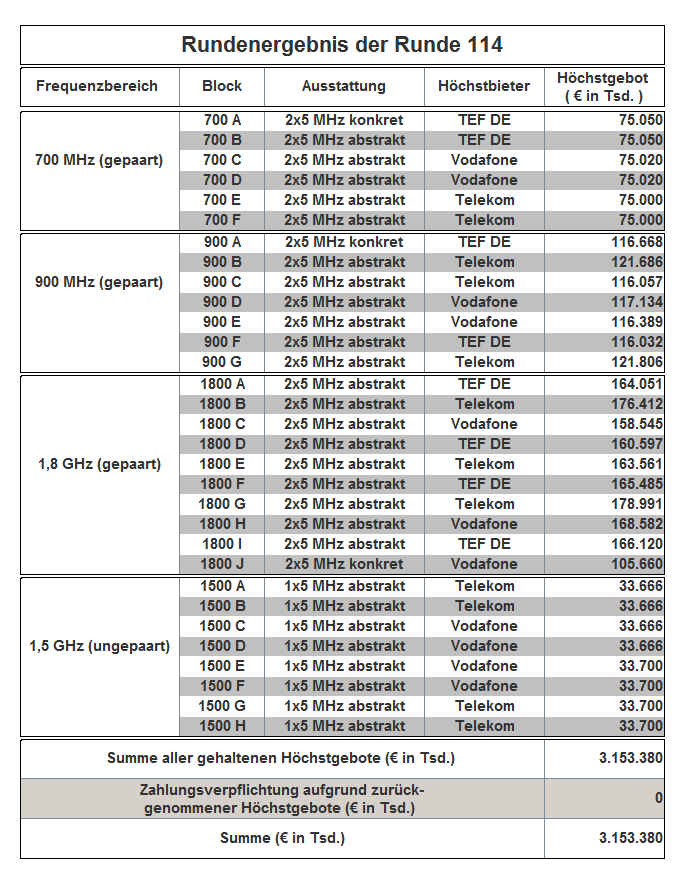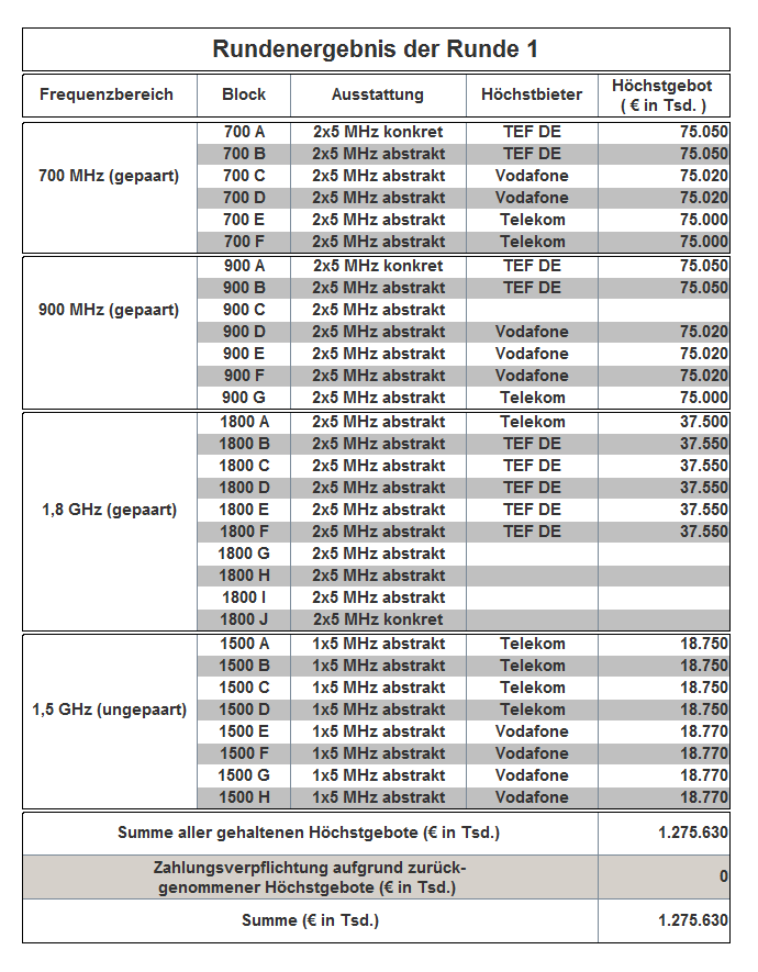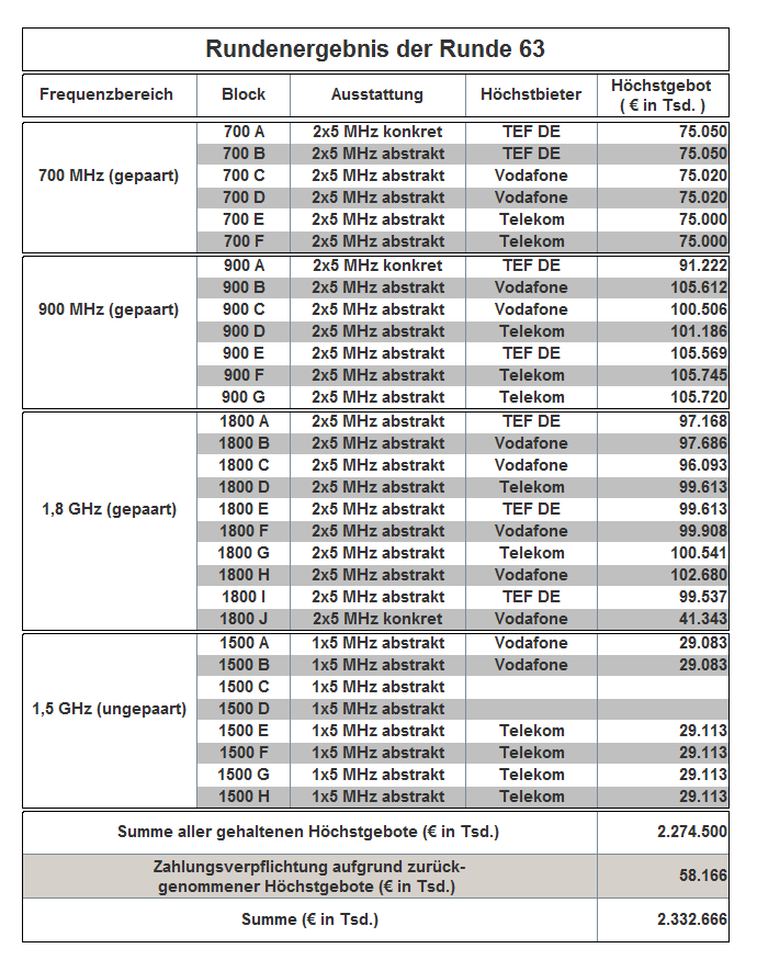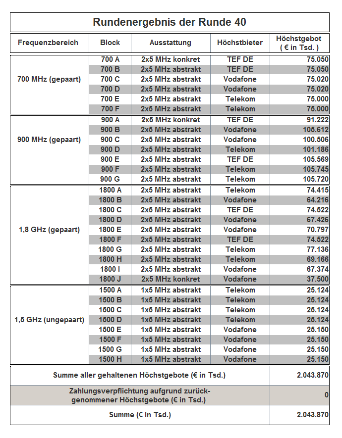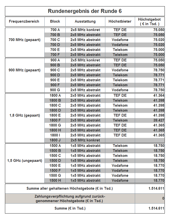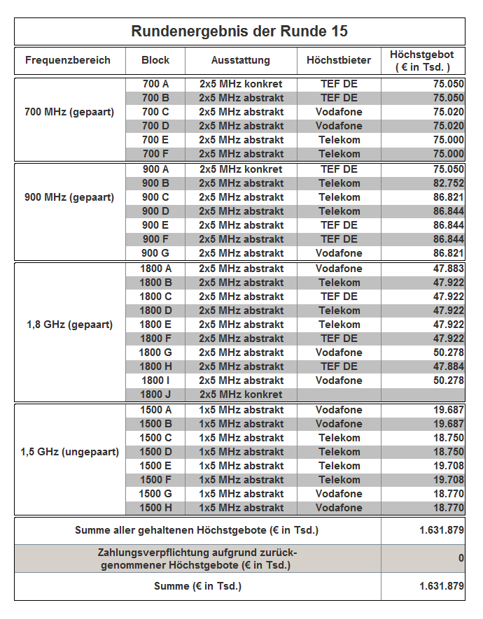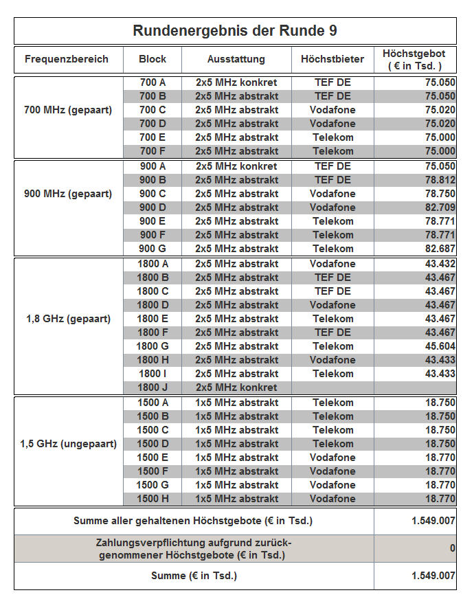 The auction has been held as an open ascending simultaneous multiround auction. The award proceedings finished in auction round 181 with the following result: