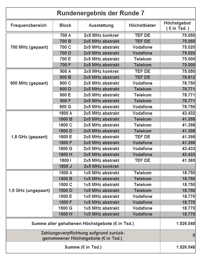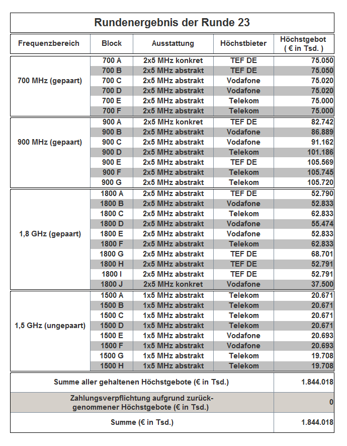 After 16 days and 181 rounds the spectrum auction for mobile broadband ended today in Mainz. All three companies, Telefónica Deutschland GmbH & Co. OHG, Telekom Deutschland GmbH and Vodafone GmbH, were successful in bidding for spectrum in line with their business models: