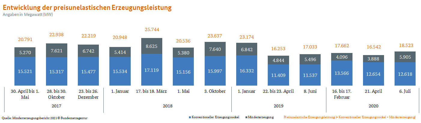 Die Mindesterzeugung lag in den betrachteten Situationen bei mindestens 4 bis 7 GW, was 23 bis 32 Prozent der gesamten preisunelastischen Erzeugungsleistung entspricht. Der konventionelle Erzeugungssockel betrug 12 bis 17 GW. Insgesamt bewegte sich die preisunelastische Erzeugungsleistung bei 17 bis 24 GW. Im Vergleich zu den Vorjahren ist die Leistung, die netztechnisch begründbar ist, somit rückläufig. Dies zeigt auch die nachfolgende Grafik.