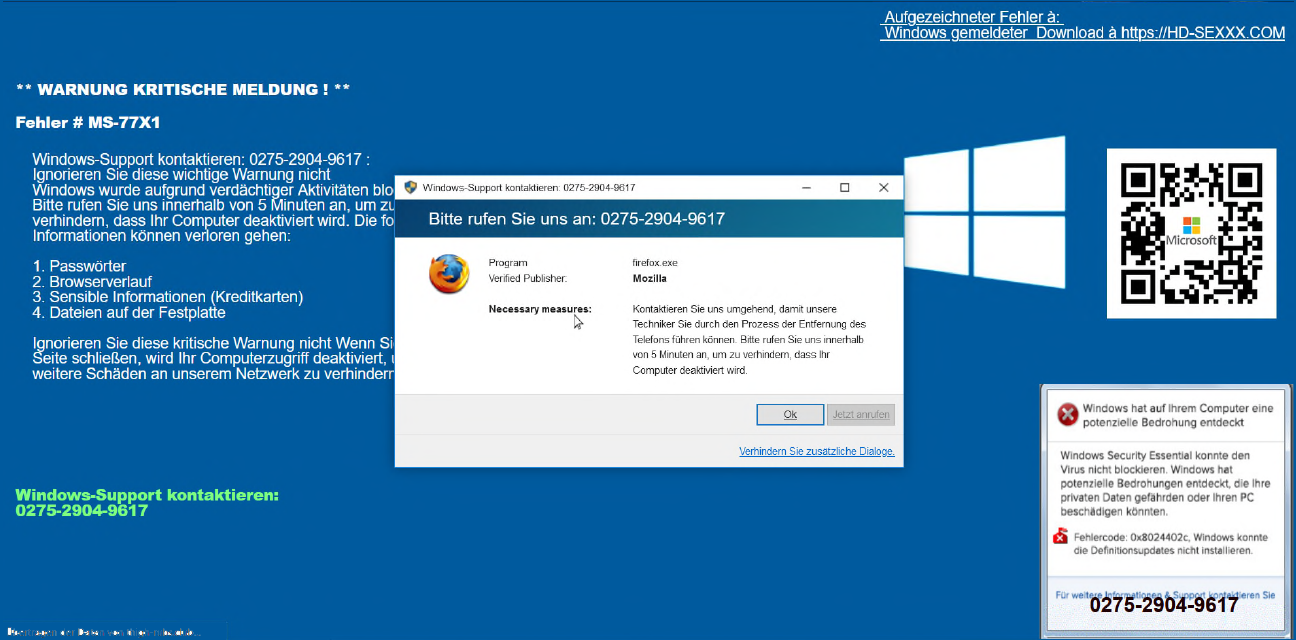 Tatsächlich bestehen keine technischen Probleme. Unbekannte täuschen die Fehler nur vor, um Sie so zu Zahlungen für unnötige Supportdienstleistungen zu veranlassen. Rufen Sie die Nummer an, gibt sich am anderen Ende der Leitung eine Person etwa als Mitarbeiter von Microsoft oder eines anderen technischen Support-Unternehmens aus. Die Betrüger versuchen, sich durch eine im Verlauf des Gesprächs erteilte Zugriffserlaubnis Zugang zu Ihrem PC zu verschaffen, um eine vermeintliche Problembehebung vorzunehmen.